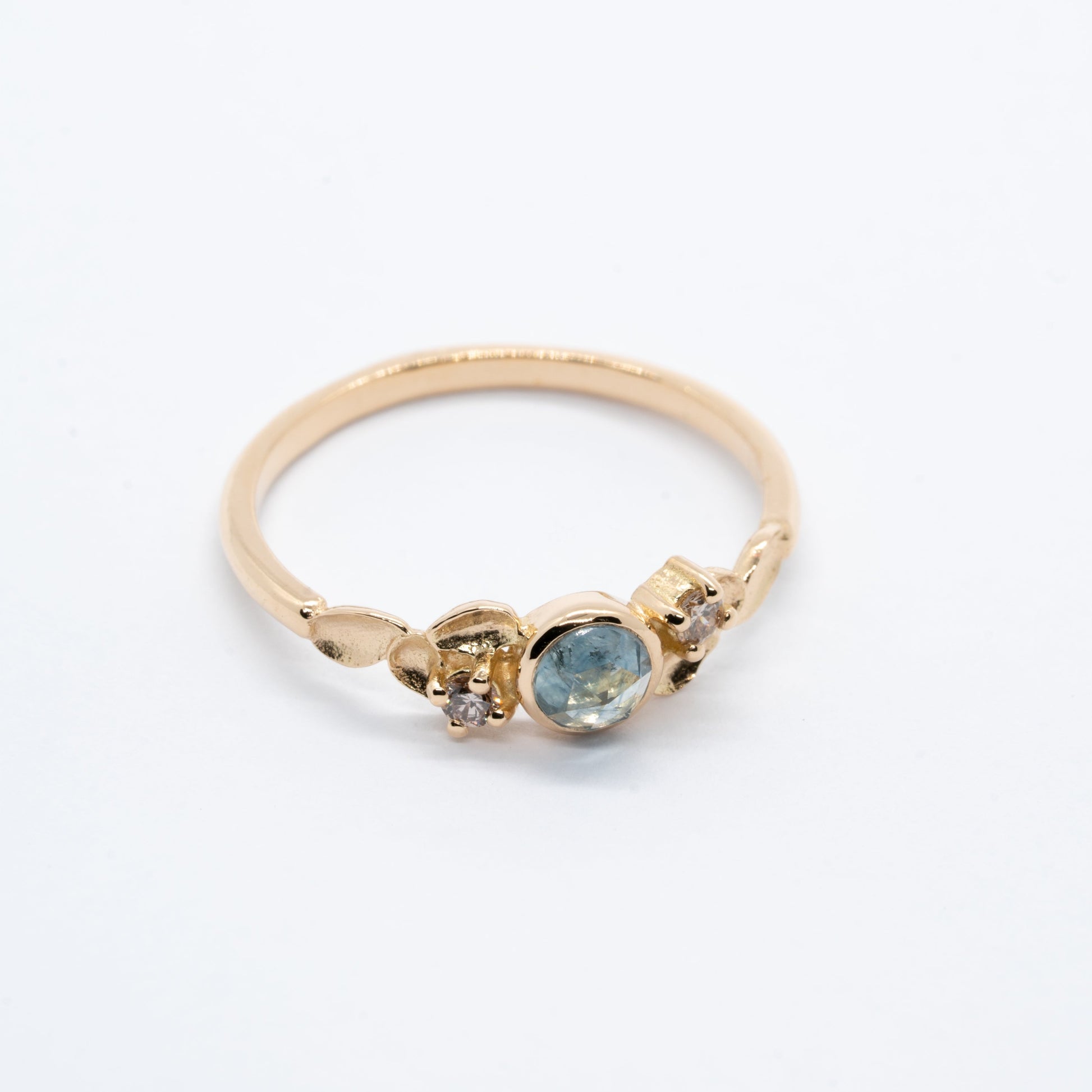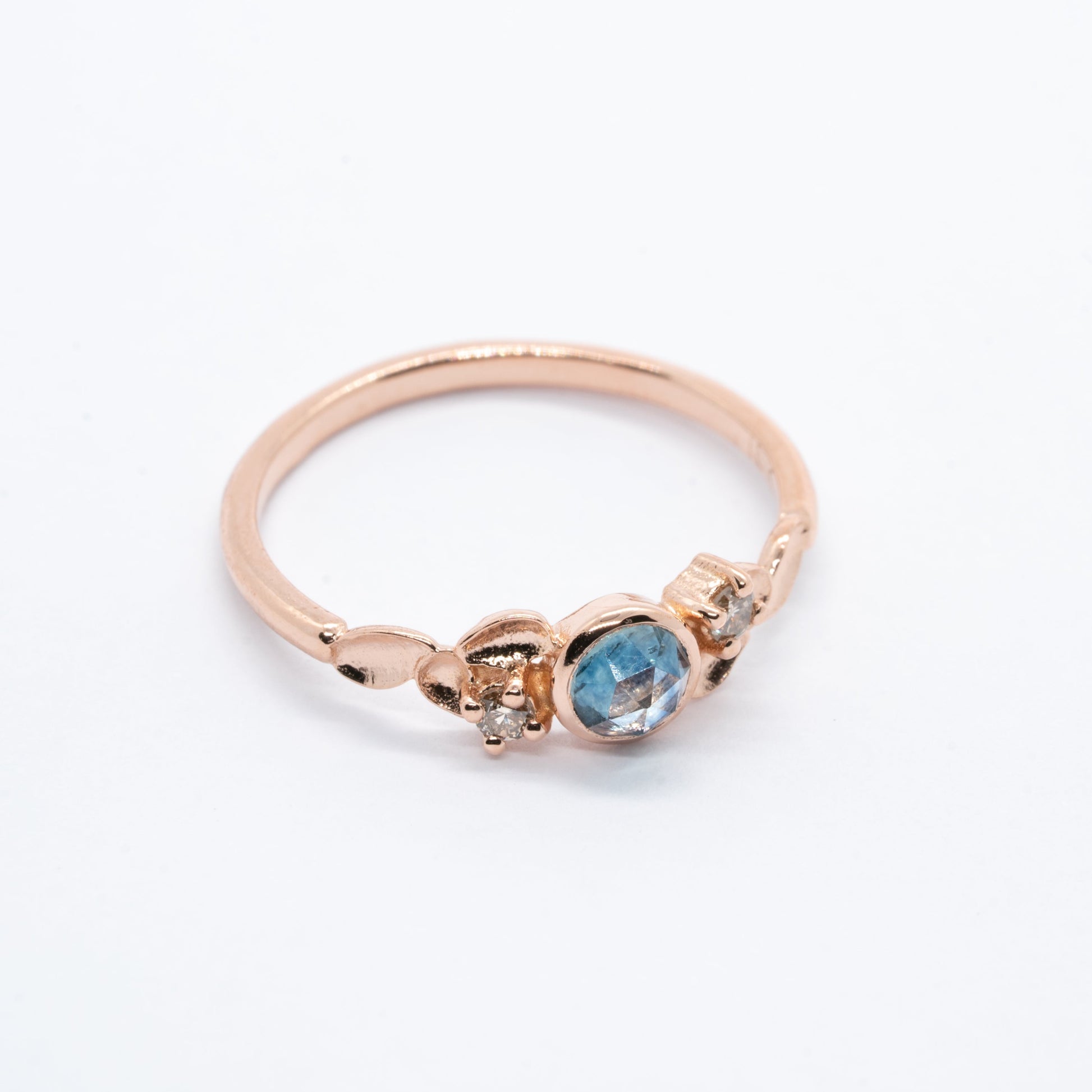 Ici un saphir du Montana rosecut au centre de 0,40 ct et deux diamants canadiens champagne 0,04 ct.