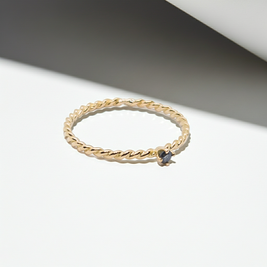 La bague twist est sertie d'un délicat diamant sel et poivre canadien de 2 mm (0,04 ct), créant un effet unique et captivant. Son design torsadé ajoute une dimension sculpturale à votre main.