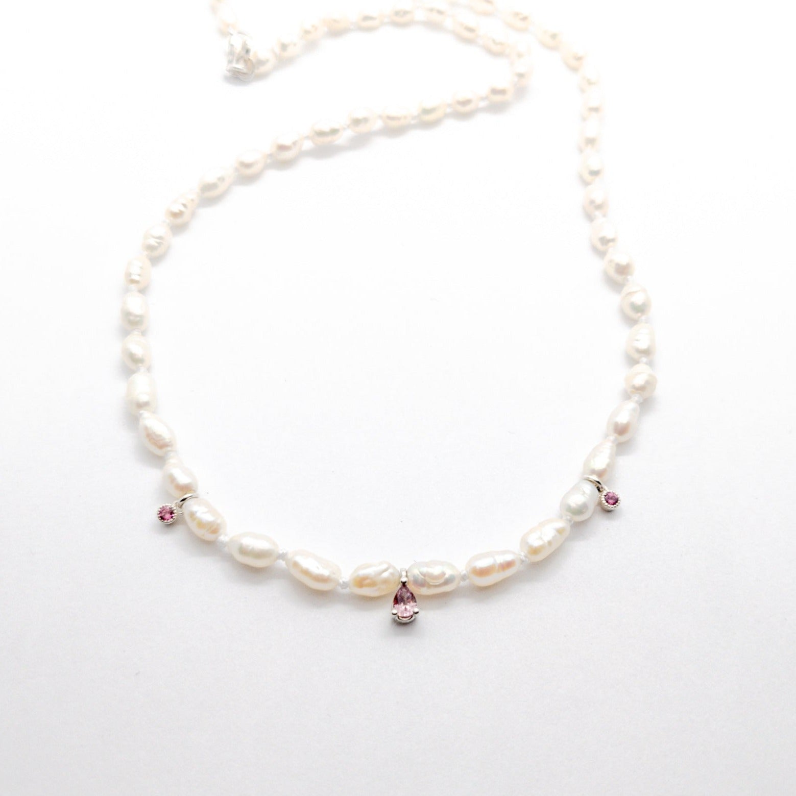 Partager Collier de perles keshis, spinelles rose taille poire et grenats rhodolites